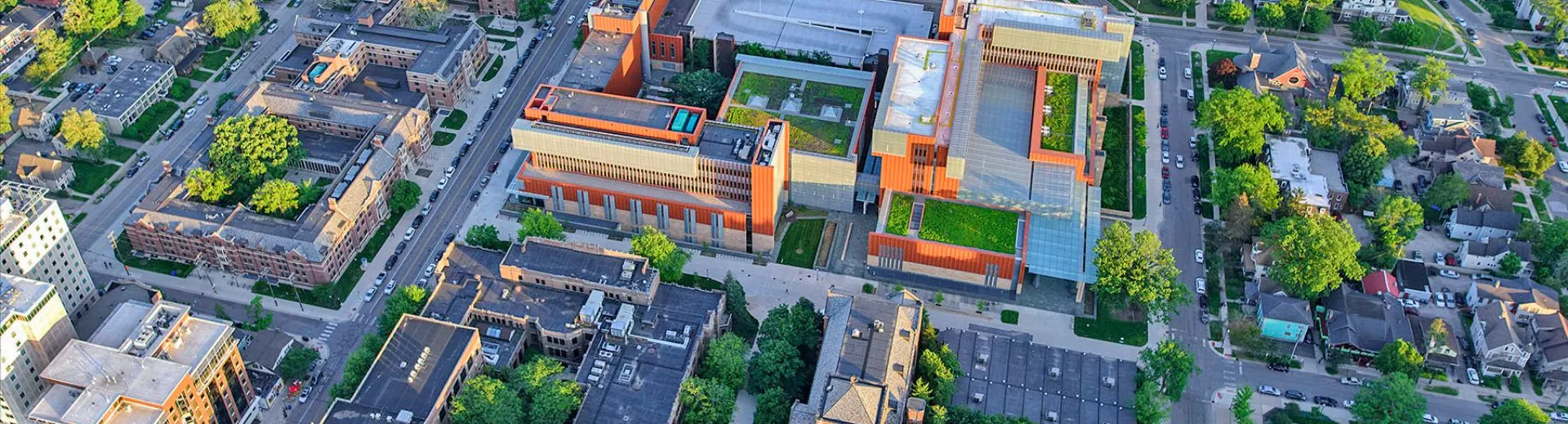 Given the historic nature of the Law School, geoexchange and ground source heat pumps and solar PV require careful consideration. The Martha Cook lawn presents an opportunity to be used for geo-exchange and ground source heat pumps in conjunction with a building energy retrofit and/or addition. Opportunities may exist to integrate geoexchange and ground source heat pumps and solar PV as part of planned additions and expansion. Building renovations should support energy efficiency and connection to a looped campus geo-exchange and ground source heat pump system.